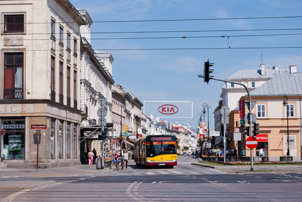 中央駅前から続くイェロゾリムスキェ通りのロータリーに、大きなサッカーボールが出来ていて、ユーロ2012で盛り上がっています、ここを曲がると、新世界通りになります。