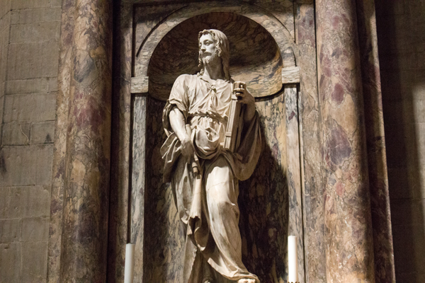 大聖堂を目指して歩いてくると、その前にある洗礼堂は、工事の覆いに囲まれていました、残念です、でも外回りだけで、中には入れ るようです。 洗礼堂と大聖堂の間は、距離が近くて、写真を撮るにも、全体が入りきらないです。 |