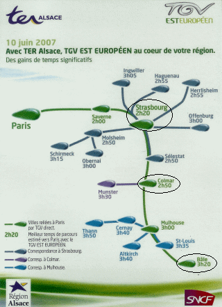 仏と独の文化が混じりあった、ストラスブールの旧市街は、1988年に世界文化遺産に登録されています。 昨日はドイツを周ったので、今日はフランスを周ります、トラムに乗ってスイス駅に向かいました、スイス駅の端がフランス駅のはずですが、よく分からずに、いちど外に出て探してしまいました、構内の端のフランスと大きく書かれた所が入り口のようですが、チケットは何処で買うのでしょうか、結局スイス駅のカウンターで良いようです、ストラスブールまでの往復で、64スイスフラン、2人で128フランですから、昨日のドイツ鉄道より安いようです、地域快速だから特別料金は掛かりません、それでも途中けっこうスピードも出ます、近距離だとドイツ鉄道のほうがICE料金分割高に感じてしまいます。
