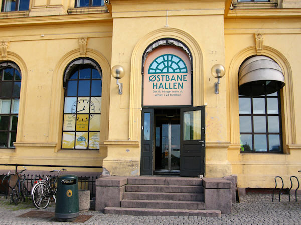 駅前広場から、一段上に近代的な駅舎、左にトラフィカンテンの塔。